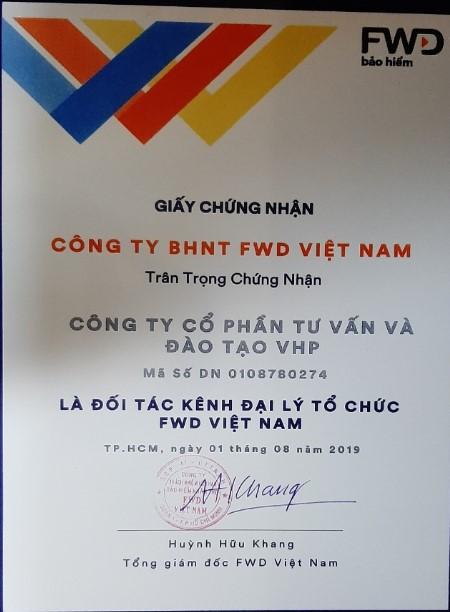 Ngày 01/8/2019, Công ty Cổ phần Tư vấn và Đào Tạo VHP đã chính thức ký kết chiến lược với mô hình hợp tác làm Đại lý tổ chức cho Công ty Trách nhiệm hữu hạn Bảo hiểm nhân thọ FWD Việt Nam (FWD).